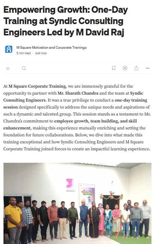 At M Square Motivation & Corporate Training, we are immensely grateful for the opportunity to partner with Mr. Sharath Chandra and the team at Syndic Consulting Engineers. It was a true privilege to conduct a one-day training session designed specifically to address the unique needs and aspirations of such a dynamic and talented group. This session stands as a testament to Mr. Chandra’s commitment to employee growth, team building, and skill enhancement, making this experience mutually enriching and setting the foundation for future collaborations. Below, we dive into what made this training exceptional and how Syndic Consulting Engineers and M Square Motivation & Corporate Training joined forces to create an impactful learning experience.