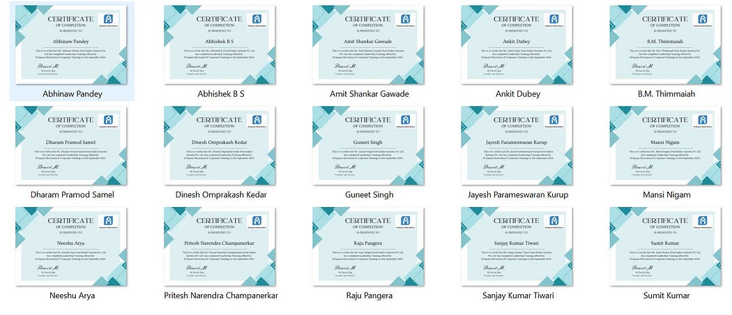 As a testament to their commitment, all participants who successfully completed the training received a Certificate of Completion from M Square Motivation. These certificates are not only a symbol of achievement but also a valuable addition to each manager’s professional portfolio, acknowledging their new skills in leadership, team building, and time management. This certification reflects Radius Systems’ commitment to nurturing leaders who are well-prepared to guide their teams and achieve operational excellence.