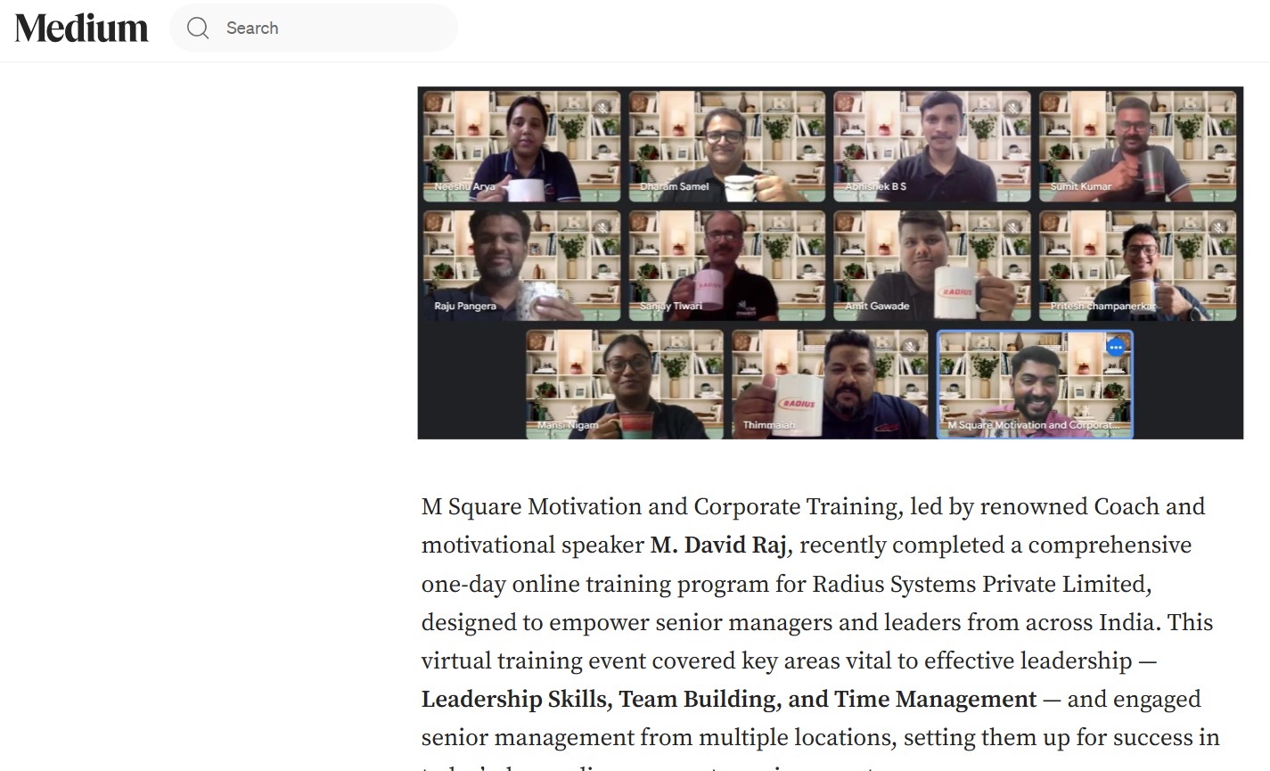 M Square Motivation and Corporate Training, led by renowned Coach and motivational speaker M. David Raj, recently completed a comprehensive one-day online training program for Radius Systems Private Limited, designed to empower senior managers and leaders from across India. This virtual training event covered key areas vital to effective leadership — Leadership Skills, Team Building, and Time Management — and engaged senior management from multiple locations, setting them up for success in today’s demanding corporate environment.